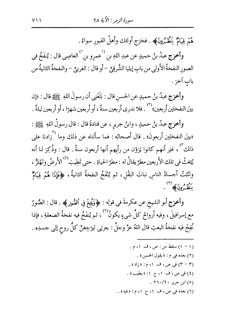 وأخرج عَبد بن حُمَيد عن الحسن قال : بلغني أن رسول الله صلى الله عليه وسلم قال : بين النفختين أربعون يقول الحسن فلا ندري أربعين سنة أو أربعين شهرا أو أربعين ليلة.