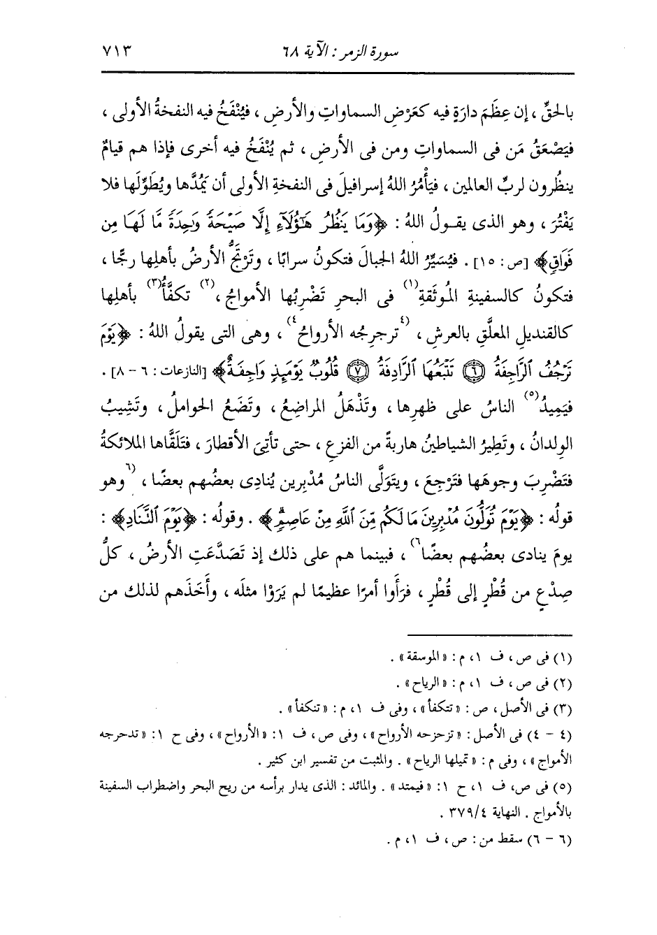 بالحق إن عظم دارة فيه لعرض السموات والأرض فينفخ فيه النفخة الأولى فيصعق من في السموات ومن في الأرض ثم ينفخ فيه أخرى {فإذا هم قيام ينظرون} لرب العالمين فيأمر الله إسرافيل عليه السلام في النفخة الأولى أن يمدها ويطولها فلا يفتر وهو الذي يقول الله (ما ينظر هؤلاء إلا صيحة واحدة ما لها من فواق) (ص 15) فيسير الله الجبال فتكون سرابا وترتج الأرض بأهلها رجا فتكون كالسفينة الموسقة في البحر تضربها الرياح تنكفأ بأهلها كالقناديل المعلقة بالعرش تميلها الرياح وهي التي يقول الله (يوم ترجف الراجفة تتبعها الرادفة قلوب يومئذ واجفة) (النازعات 5 - 8) فيميد الناس على ظهرها وتذهل المراضع وتضع الحوامل وتشيب الولدان وتطير الشياطين هاربة من الفزع حتى تأتي الأقطار فتلقاها الملائكة فتضرب وجوهها فترجع وتولي الناس به مدبرين ينادي بعضهم بعضا ، فبينما على ذلك إذ تصدعت الأرض كل صدع من قطر إلى قطر فرأوا أمرا عظيما لم يروا مثله وأخذهم لذلك من
