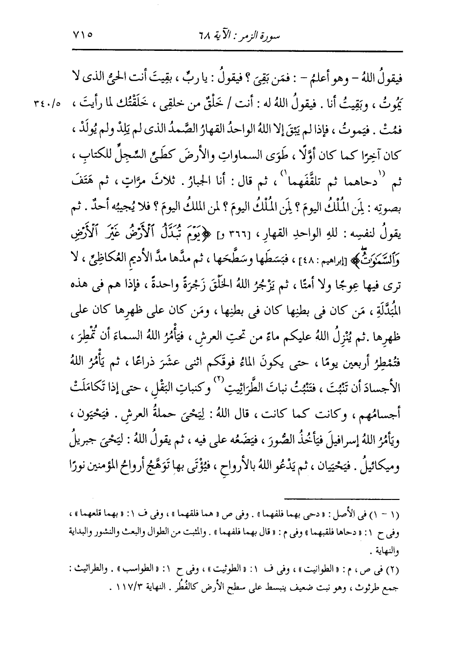 فيقول الله عز وجل - وهو أعلم - فمن بقي فيقول : يا رب بقيت أنت الحي الذي لا تموت وبقي حملة عرشك وبقيت أنا ، فيقول الله له : ليمت حملة عرشي ، فيموتون ويأمر الله العرش فيقبض الصور ثم يأتي ملك الموت الرب عز وجل فيقول : يا رب مات حملة عرشك فيقول الله - وهو أعلم - فمن بقي فيقول : يا رب بقيت أنت الحي الذي لا يموت وبقيت أنا ، فيقول الله له : أنت خلق من خلقي خلقتك لما رأيت فمت فيموت فإذا لم يبق إلا الله الواحد القهار الصمد الذي لم يلد ولم يولد كان آخرا كما كان أولا طوى السموات والأرض كطي السجل للكتاب ، ثم قال بهما فلفهما ، ثم قال : أنا الجبار أنا الجبار أنا الجبار ثلاث مرات ، ثم هتف بصوته لمن الملك اليوم لمن الملك اليوم لمن الملك اليوم فلا يجيبه أحد ، ثم يقول لنفسه : لله الواحد القهار (يوم تبدل الأرض غير الأرض والسموات) (إبراهيم 48) فبسطها وسطحها ثم مدها مد الأديم العكاظي (لا ترى فيها عوجا ولا أمتا) (طه الآية 107) ثم يزجر الله الخلق زجرة واحدة فإذا هم في هذه المبدلة من كان في بطنها كان في بطنها ومن كان على ظهرها كان على ظهرها ، ثم ينزل الله عليكم ماء من تحت العرش فيأمر الله السماء أن تمطر فتمطر أربعين يوما حتى يكون الماء فوقكم إثني عشر ذراعا ثم يأمر الله الأجساد أن تنبت فتنبت نبات الطوانيت كنبات البقل حتى إذا تكاملت أجسامهم وكانت كما كانت قال الله : ليحيى حملة العرش فيحيون ويأمر الله إسرافيل فيأخذ الصور فيضعه على فيه ثم يقول الله : ليحيى جبريل وميكائيل فيحييان ، ثم يدعو الله بالأرواح