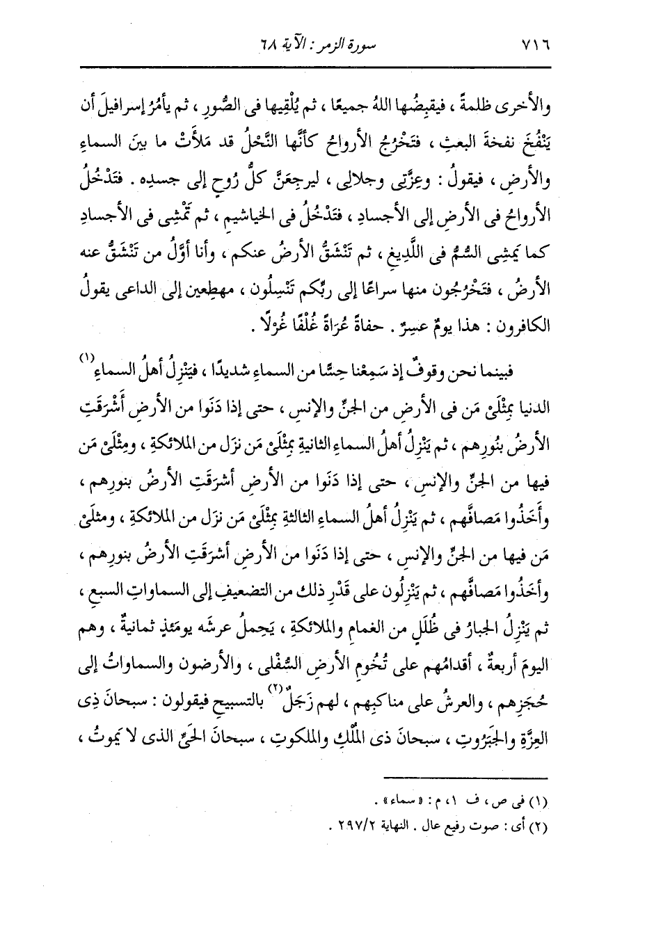 والأخرى ظلمة فيقبضهن الله جميعا ثم يلقيها في الصور ثم يأمر إسرافيل أن ينفخ نفخة البعث فتخرج الأرواح كأنها النحل قد ملأت ما بين السماء والأرض ، فيقول : وعزتي وجلالي ليرجعن كل روح إلى جسده فتدخل الأرواح في الأرض إلى الأجساد فتدخل في الخياشيم ثم تمشي في الأجساد كما يمشي السم في اللديغ ثم تنشق الأرض عنكم ، وأنا أول من تنشق الأرض عنه فتخرجون منها سراعا إلى ربكم تنسلون مهطعين إلى الداعي يقول الكافرون هذا يوم عسر حفاة عراة غلفا غرلا ، فبينما نحن وقوف إذ سمعنا حسا من السماء شديدا فينزل أهل سماء الدنيا بمثلي من في الأرض من الجن والإنس حتى إذا دنوا من الأرض أشرقت الأرض بنورهم ، ثم ينزل أهل السماء الثانية بمثلي من نزل من الملائكة ومثلي من فيها من الجن والإنس حتى إذا دنوا من الأرض أشرقت الأرض بنورهم وأخذوا مصافهم ، ثم ينزل أهل السماء الثالثة بمثلي من نزل من الملائكة ومثلي من فيها من الجن والإنس حتى إذا دنوا من الأرض أشرقت الأرض بنورهم وأخذوا مصافهم ، ثم ينزلون على قدر ذلك من التضعيف إلى السموات السبع ، ثم ينزل الجبار (في ظلل من الغمام) (البقرة 210) والملائكة يحمل عرشه يومئذ ثمانية وهم اليوم أربعة ، أقدامهم على تخوم الأرض السفلى والأرضون والسموات إلى حجزهم والعرش على مناكبهم لهم زجل بالتسبيح فيقولون : سبحان ذي العزة والجبروت سبحان ذي الملك والملكوت سبحان الحي الذي لا يموت
