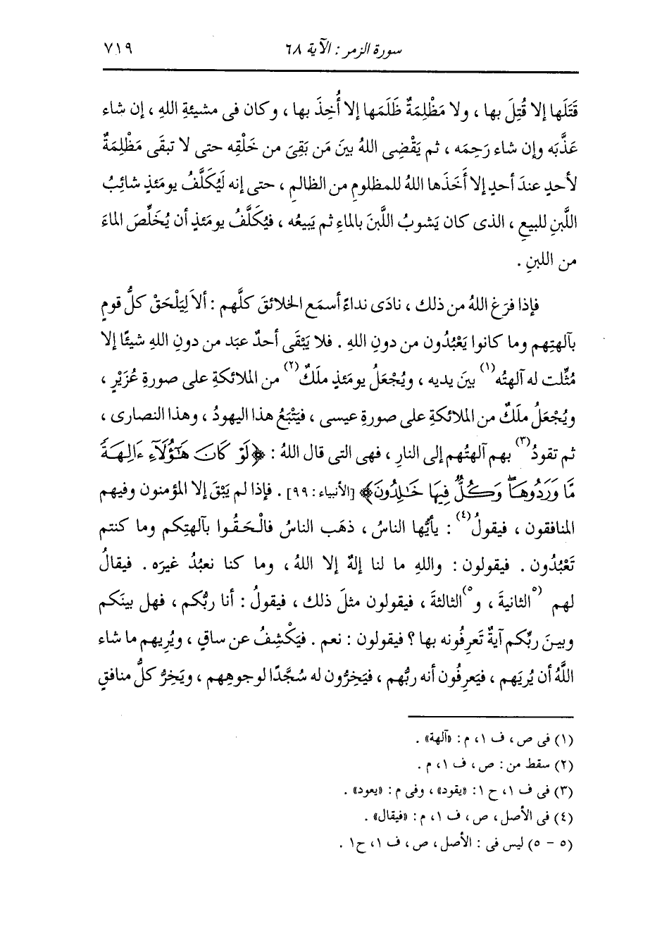 قتلها إلا قتل بها ولا مظلمة ظلمها إلا أخذ بها ، وكان في مشيئة الله تعالى إن شاء عذبه وإن شاء رحمه ثم يقضي الله بين من بقي من خلقه حتى لا يبقى مظلمة لأحد عند أحد إلا أخذها الله تعالى للمظلوم من الظالم ، حتى إنه ليكلف يومئذ شائب اللبن للبيع الذي كان يشوب اللبن بالماء ثم يبيعه فيكلف أن يخلص اللبن من الماء ، فإذا فرغ الله من ذلك نادى نداء أسمع الخلائق كلهم : ألا ليلحق كل قوم بآلهتهم وما كانوا يعبدون من دون الله ، فلا يبقى أحد عبد من دون الله شيئا إلا مثلت له آلهة بين يديه ويجعل يومئذ من الملائكة على صورة عزير ويجعل ملك