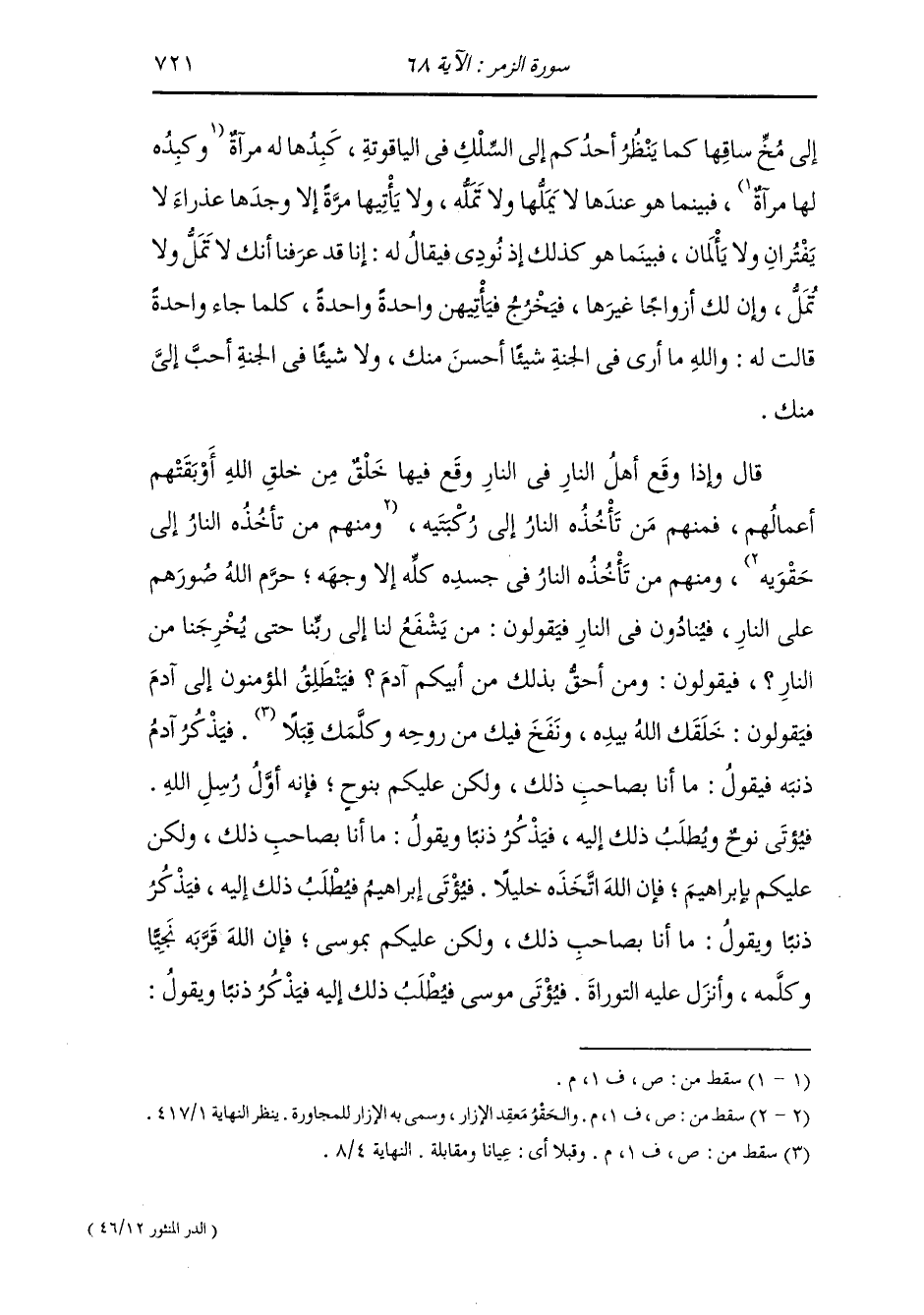 إلى مخ ساقها كما ينظر أحدكم إلى السلك في الياقوتة كبدها له مرآة ، فبينما هو عندها لا يملها ولا تمله ولا يأتيها مرة إلا وجدها عذراء لا يفتران ولا يألمان ، فبينما هو كذلك إذ نودي فيقال له : إنا قد عرفنا أنك لا تمل ولا تمل وإن لك أزواجا غيرها فيخرج فيأتيهن واحدة واحدة كلما جاء واحدة قالت له : والله ما أرى في الجنة شيئا أحسن منك ولا شيئا في الجنة أحب إلي منك ، قال وإذا وقع أهل النار في النار وقع فيها خلق من خلق الله أوبقتهم أعمالهم فمنهم من تأخذه النار إلى ركبتيه ومنهم من تأخذه النار في جسده كله إلا وجهه حرم
