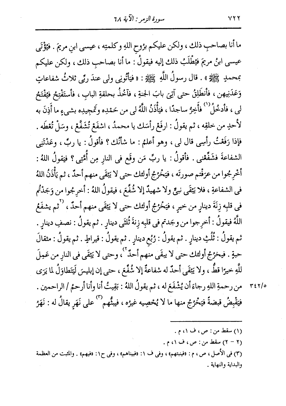 ما أنا بصاحب ذلك ولكن عليكم بروح الله وكلمته عيسى بن مريم عليه السلام ، فيؤتى عيسى بن مريم عليه السلام فيطلب ذلك إليه فيقول : ما أنا بصاحب ذلك ولكن عليكم بمحمد صلى الله عليه وسلم ، فيأتوني ولي عند ربي ثلاث شفاعات وعدنيهن فأنطلق حتى آتي باب الجنة فآخذ بحلقة الباب فاستفتح فيفتح لي فأخر ساجدا فيأذن لي من حمده وتمجيده بشيء ما أذن به لأحد من خلقه ثم يقول : ارفع رأسك يا محمد اشفع تشفع وسل تعطه ، فإذا رفعت رأسي قال لي - وهو أعلم - ما شأنك فأقول : يا رب وعدتني الشفاعة فشفعني ، فأقول يا رب من وقع في النار من أمتي فيقول الله : أخرجوا من عرفتم صورته فيخرج أولئك حتى لا يبقى منهم أحد ثم يأذن الله بالشفاعة فلا يبقى نبي ولا شهيد إلا شفع فيقول الله : أخرجوا من وجدتم في قلبه زنة دينار من خير فيخرج أولئك حتى لا يبقى منهم أحد وحتى لا يبقى في النار من عمل خيرا قط ولا يبقى أحد له شفاعة إلا شفع ، حتى أن إبليس ليتطاول في النار لما يرى من رحمة الله رجاء أن يشفع له ثم يقول الله : بقيت وأنا أرحم الراحمين فيقبض قبضة فيخرج منها ما لا يحصيه غيره فينبتهم على نهر يقال له نهر