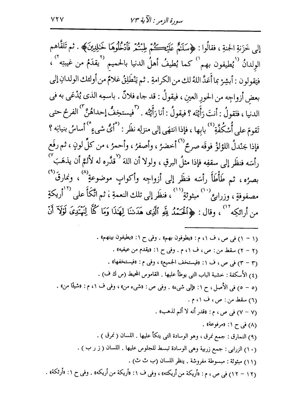 إلى خزنة الجنة فقالوا {سلام عليكم طبتم فادخلوها خالدين} ثم تلقاهم الولدان يطوفون بهم كما يطيف أهل الدنيا بالحميم فيقولون : ابشر بما أعد الله لك من الكرامة ثم ينطلق غلام من أولئك الولدان إلى بعض أزواجه من الحور العين فيقول : قد جاء فلان باسمه الذي يدعى به في الدنيا فتقول : أنت رأيته فيقول : أنا رأيته فيستخفها الفرح حتى تقوم على أسكفة بابها فإذا انتهى إلى منزله نظر شيئا من أساس بنيانه فإذا جندل اللؤلؤ فوقه أخضر وأصفر وأحمر من كل لون ، ثم رفع رأسه فنظر إلى