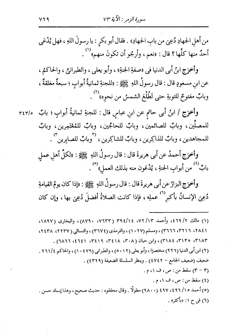 من أهل الجهاد دعي من باب الجهاد ، فقال أبو بكر رضي الله عنه : يا رسول الله فهل يدعى أحد منها كلها قال : نعم وأرجو أن تكون منهم.