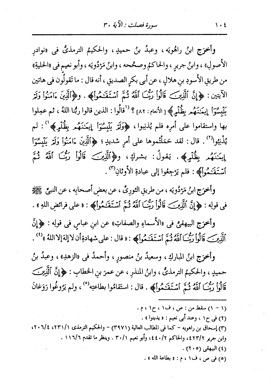 وأخرج ابن راهويه ، وعَبد بن حُمَيد والحكيم الترمذي في نوادر الأصول ، وَابن جَرِير والحاكم وصححه ، وَابن مردويه وأبو نعيم في الحلية من طريق الأسود بن هلال عن أبي بكر الصديق رضي الله عنه أنه قال : ما تقولون في هاتين الآيتين {إن الذين قالوا ربنا الله ثم استقاموا} و{الذين آمنوا ولم يلبسوا إيمانهم بظلم} الأنعام قالوا : لم يذنبوا قال : لقد حملتموها على أمر شديد (الذين آمنوا ولم يلبسوا إيمانهم بظلم) يقول : بشرك و{الذين قالوا ربنا الله ثم استقاموا} فلم يرجعوا إلى عبادة الأوثان.