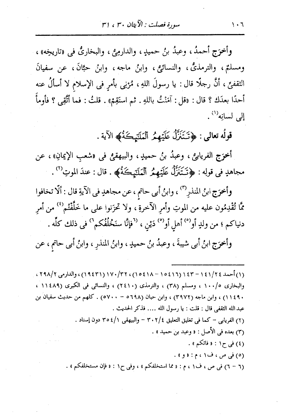 وأخرج الفريابي ، وعَبد بن حُمَيد والبيهقي في الشعب عن مجاهد في قوله {تتنزل عليهم الملائكة} قال : عند الموت.