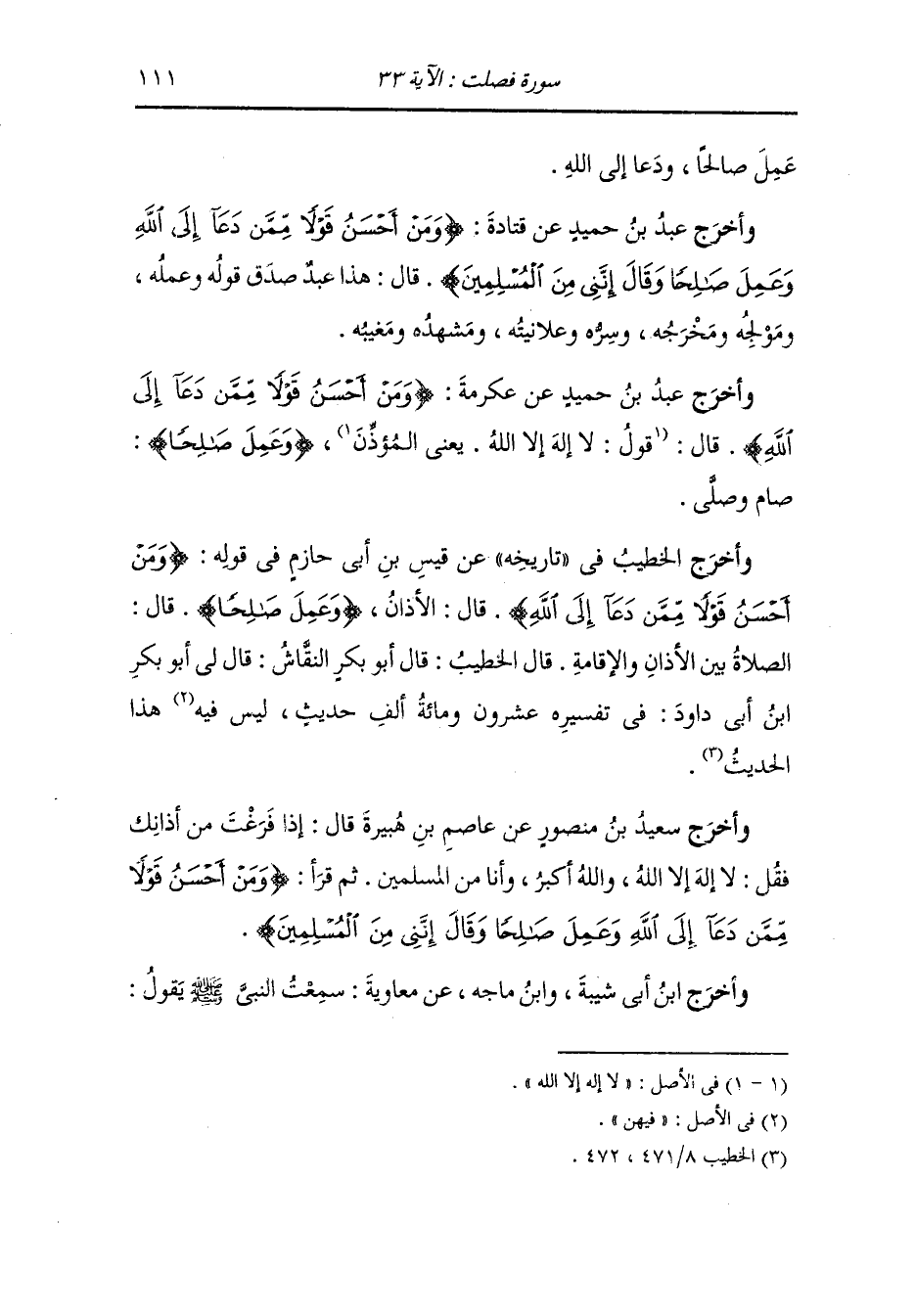 وأخرج الخطيب في تاريخه عن قيس بن أبي حازم رضي الله عنه في قوله {ومن أحسن قولا ممن دعا إلى الله} قال الآذان {وعمل صالحا} قال : الصلاة بين الآذان والإقامة قال الخطيب : قال أبو بكر النقاش رضي الله عنه قال لي أبو بكر بن أبي داود في تفسيره عشرون ومائة ألف حديث ليس فيه هذا الحديث.