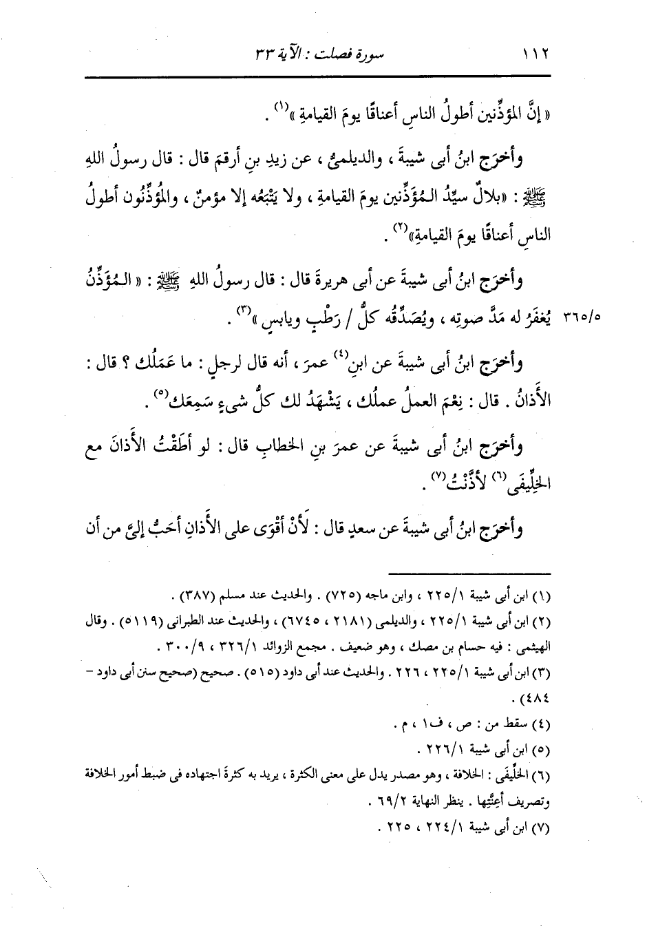 وأخرج ابن أبي شيبة والديلمي عن زيد بن أرقم رضي الله عنه قال : قال رسول الله صلى الله عليه وسلم : بلال سيد المؤذنين يوم القيامة ولا يتبعه إلا مؤمن والمؤذنون أطول الناس أعناقا يوم القيامة.