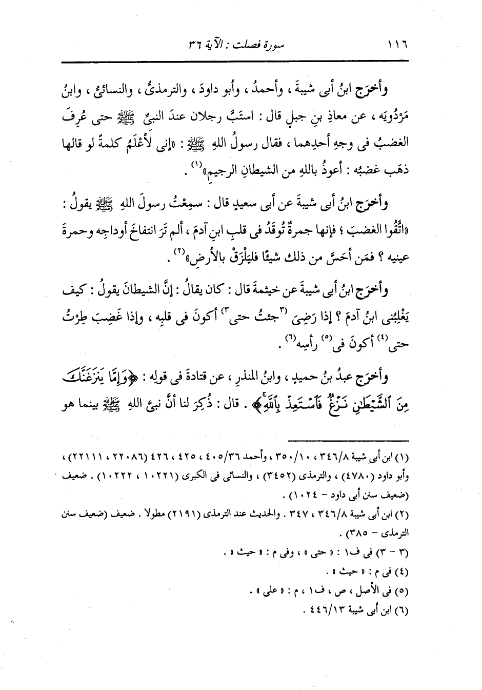 وأخرج ابن أبي شيبة وأحمد وأبو داود والترمذي والنسائي ، وَابن مردويه عن معاذ بن جبل رضي الله عنه قال : استب رجلان عند النَّبِيّ صلى الله عليه وسلم حتى عرف الغضب في وجه أحدهما فقال رسول الله صلى الله عليه وسلم : إني لأعلم كلمة لو قالها ذهب غضبه ، أعوذ بالله من الشيطان الرجيم.