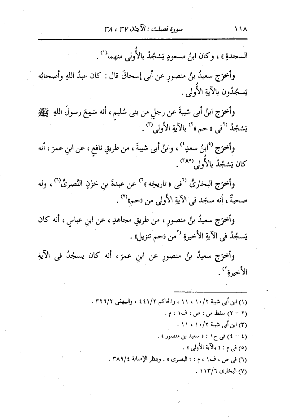وأخرج سعيد بن منصور عن أبي إسحاق قال : كان عبد الله رضي الله عنه وأصحابه يسجدون بالآية الأولى.