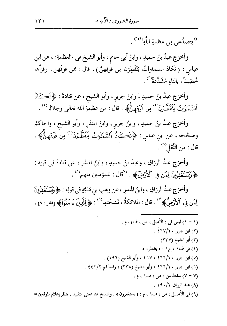 وَأخرَج عَبد بن حُمَيد ، وَابن جَرِير ، وَابن المنذر وأبو الشيخ والحاكم وصححه عن ابن عباس رضي الله عنهما {تكاد السماوات يتفطرن من فوقهن} قال : من الثقل.