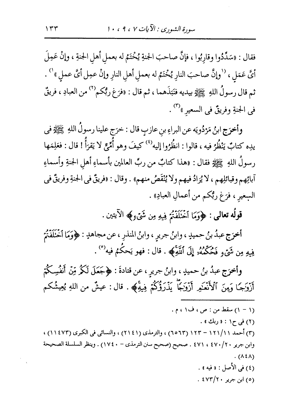 وأخرج ابن مردويه عن البراء بن عازب رضي الله عنه قال : خرج علينا رسول الله صلى الله عليه وسلم في يده كتاب ينظر فيه قال : انظروا إليه كيف وهو أمي لا يقرأ قال : فعلمها رسول الله صلى الله عليه وسلم فقال : هذا كتاب من رب العالمين بأسماء أهل الجنة وأسماء آبائهم وقبائلهم لا يزاد فيهم ولا ينقص منهم وقال : {فريق في الجنة وفريق في السعير} فرغ ربكم من أعمال العباد.