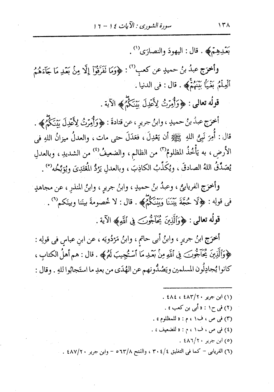 أَخرَج عَبد بن حميد ، وَابن جَرِير عن قتادة {وأمرت لأعدل بينكم} قال : أمر نبي الله - صلى الله عليه وسلم - أن يعدل فعدل حتى مات ، والعدل ميزان الله في الأرض به يأخذ للمظلوم من الظالم وللضعيف من الشديد وبالعدل يصدق الله الصادق ويكذب الكاذب وبالعدل يرد المعتدي ويوبخه.