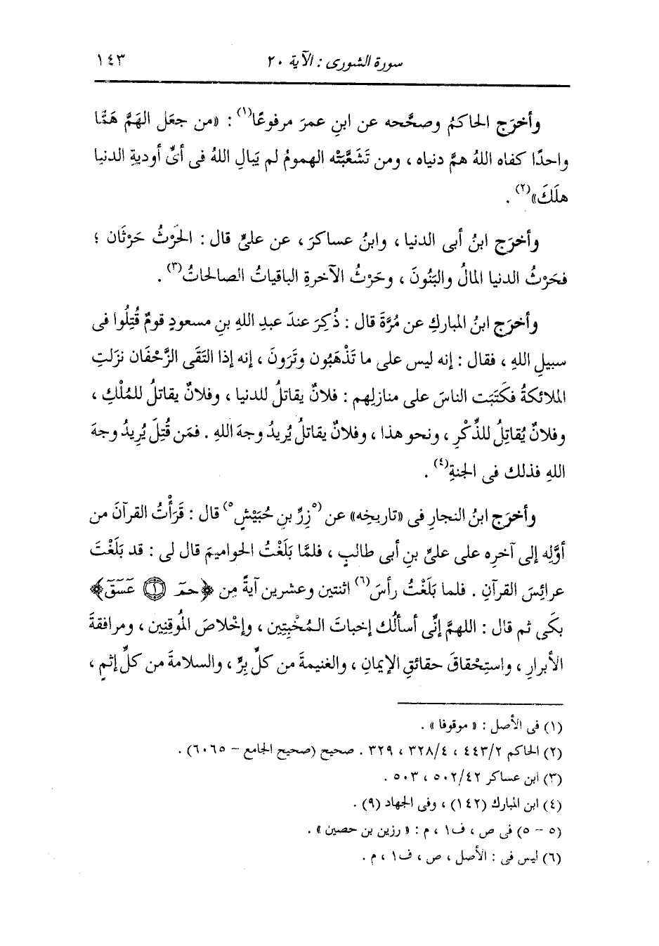 وأخرج ابن النجار في تاريخه عن رزين بن حصين - رضي الله عنه - قال : قرأت القرآن من أوله إلى آخره على علي بن أبي طالب - رضي الله عنه - فلما بلغت الحواميم قال لي : قد بلغت عرائس القرآن فلما بلغت اثنتين وعشرين آية من {حم عسق} بكى ثم قال : اللهم إني أسألك إخبات المخبتين وخلاص الموقنين ومرافقة الأبرار واستحقاق حقائق الإيمان والغنيمة من كل بر والسلامة من كل إثم