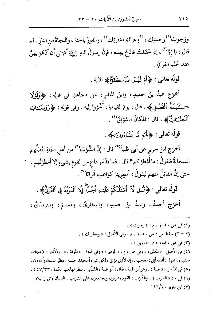 من طريق طاووس عن ابن عباس - رضي الله عنهما - أنه سئل عن قوله {إلا المودة في القربى} فقال سعيد بن جبير : - رضي الله عنه - قربى آل محمد فقال ابن عباس : - رضي الله عنهما - عجلت أن النَّبِيّ صلى الله عليه وسلم لم يكن بطن من قريش إلا كان له فيهم قرابة فقال : ألا أن تصلوا ما بيني وبينكم من القرابة.