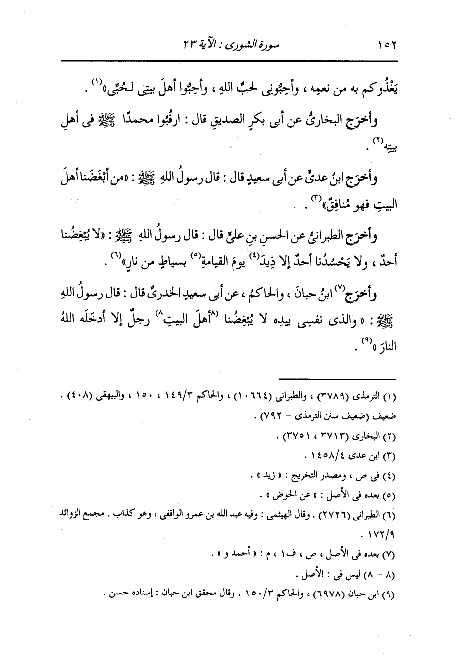 وأخرج الطبراني والخطيب من طريق أبي الضحى عن ابن عباس رضي الله عنهما قال : جاء العباس إلى رسول الله - صلى الله عليه وسلم - فقال : إنك قد تركت فينا ضغائن منذ صنعت الذي صنعت فقال النَّبِيّ صلى الله عليه وسلم : لا يبلغوا الخير أو الإيمان حتى يحبوكم.