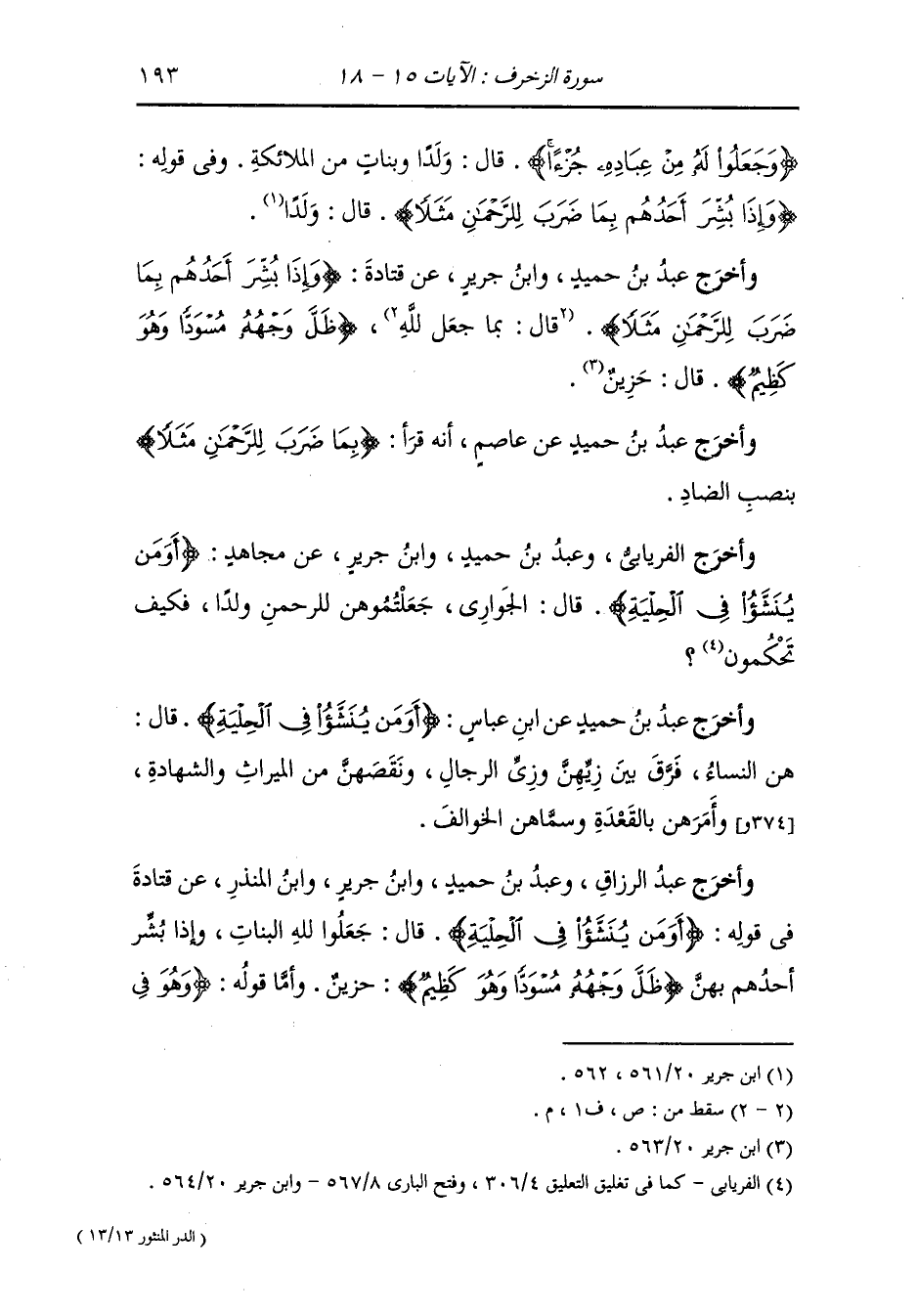 أخرج عَبد بن حُمَيد ، وَابن المنذر عن قتادة رضي الله عنه {وجعلوا الملائكة الذين هم عباد الرحمن إناثا} قال : قد قال ذلك أناس من الناس