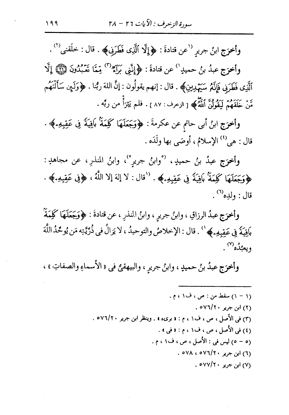 عن قتادة : (وجعلها كلمة باقية في عقبه) قال : شهادة أن لا إله إلا الله والتوحيد ، لايزال في ذريته من يقولها من بعده {لعلهم يرجعون} قال : يتوبون أو يذكرون.
