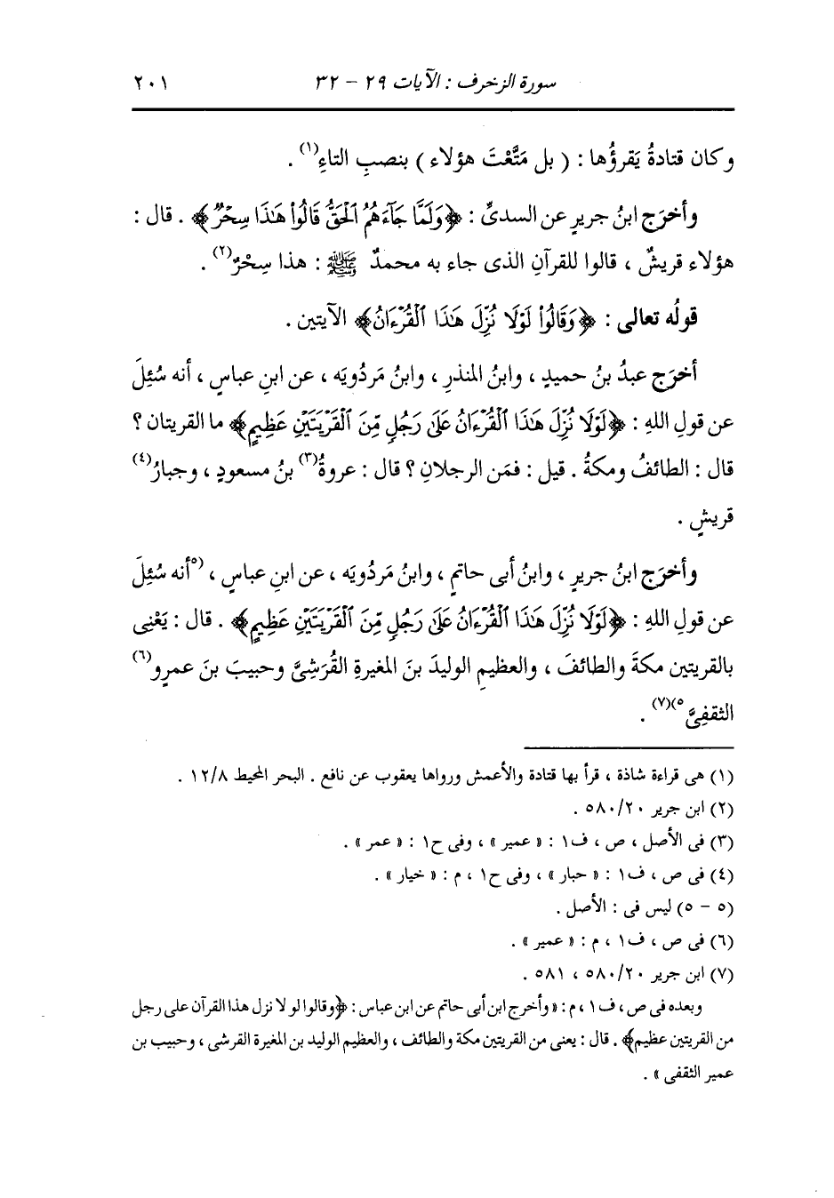 وأخرج عَبد بن حُمَيد ، وَابن جَرِير عن قتادة {وقالوا لولا نزل هذا القرآن على رجل من القريتين عظيم} قال : القريتان مكة والطائف ، قال ذلك مشركو قريش ، قال : بلغنا أنه ليس فخذ من قريش إلا قد ادعته فقالوا : هو منا وكنا نحدث أنه الوليد بن المغيرة وعروة بن مسعود الثقفي ، قال : يقولون فهلا كان أنزل على أحد هذين الرجلين ليس على محمد صلى الله عليه وسلم.