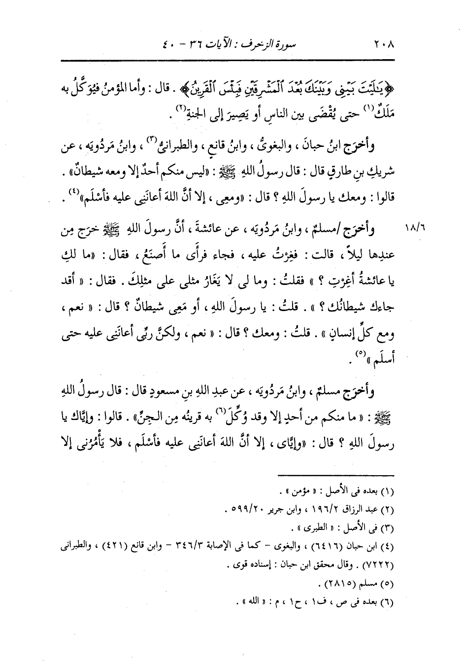 وأخرج ابن مردويه عن ابن عباس رضي الله عنهما قال : قال رسول الله صلى الله عليه وسلم : ما منكم من أحد إلا وقد وكل الله به قرينه من الجن ، قالوا : وإياك يا رسول الله قال : وإياي إلا أن الله أعانني عليه فأسلم.