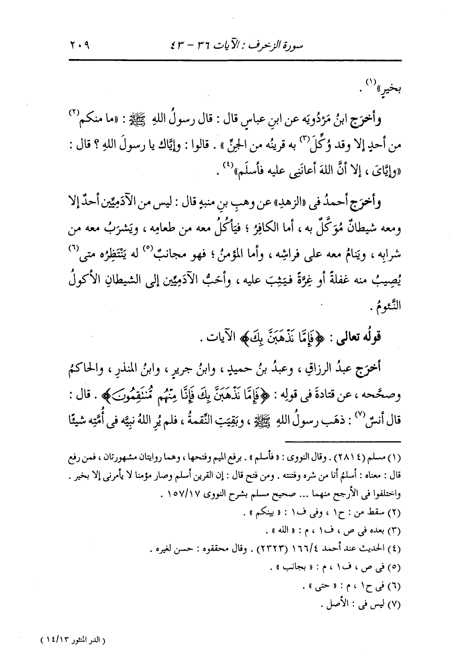 وأخرج ابن مردويه والبيهقي في شعب الإيمان من طريق حميد عن أنس بن مالك رضي الله عنه في قوله : {فإما نذهبن بك فإنا منهم منتقمون} الآية ، قال : أكرم الله نبيه صلى الله عليه وسلم أن يريه في أمته ما يكره فرفعه إليه وبقيت النقمة.