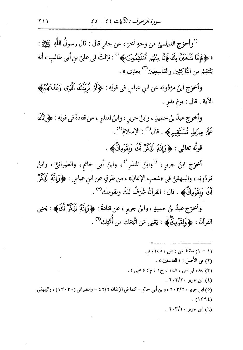 وأخرج الشافعي وعبد الرزاق وسعيد بن منصور ، وعَبد بن حُمَيد ، وَابن جَرِير ، وَابن المنذر ، وَابن أبي حاتم والبيهقي عن مجاهد في قوله : {وإنه لذكر لك ولقومك} قال : يقال ممن هذا الرجل فيقال : من العرب فيقال : من أي العرب فيقال : من قريش فيقال : من أي قريش فيقال : من بني هاشم.