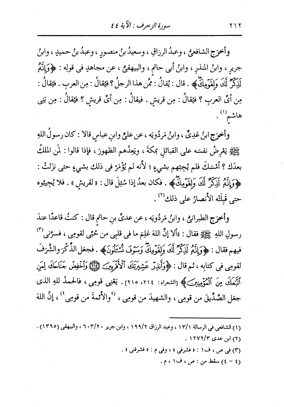 قلب العباد ظهرا وبطنا فكان خير العرب قريش وهي الشجرة المباركة التي قال الله في كتابه (ومثل كلمة طيبة كشجرة طيبة) (إبراهيم الآية 24) يعني بها قريشا (أصلها ثابت) يقول : أصلها كرم (وفرعها في السماء) يقول : الشرف الذي شرفهم الله بالإسلام الذي هداهم له وجعلهم أهله ، ثم أنزل فيهم سورة من كتاب الله بمكة (لإيلاف قريش) (قريش الآية 1 - 2 - 3 - 4) إلى آخرها قال عدي بن حاتم : ما رأيت رسول الله صلى الله عليه وسلم ذكر عنده قريش بخير قط إلا سره حتى يتبين ذلك السرور للناس كلهم في وجهه وكان كثيرا ما يتلوا هذه الآية {وإنه لذكر لك ولقومك وسوف تسألون}.