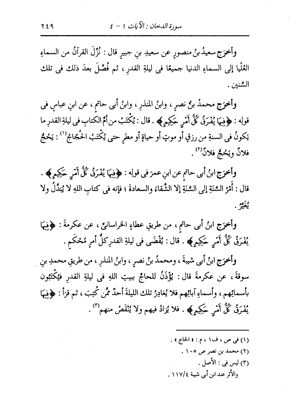 وأخرج سعيد ، وعَبد بن حُمَيد ، وَابن جَرِير ، وَابن المنذر عن مجاهد رضي الله عنه أنه سئل عن قوله {حم والكتاب المبين إنا أنزلناه في ليلة مباركة إنا كنا منذرين} {فيها يفرق كل أمر حكيم} قال : يفرق {في ليلة القدر} ما يكون من السنة إلى السنة إلا الحياة والموت يفرق فيها المعايش والمصائب كلها.
