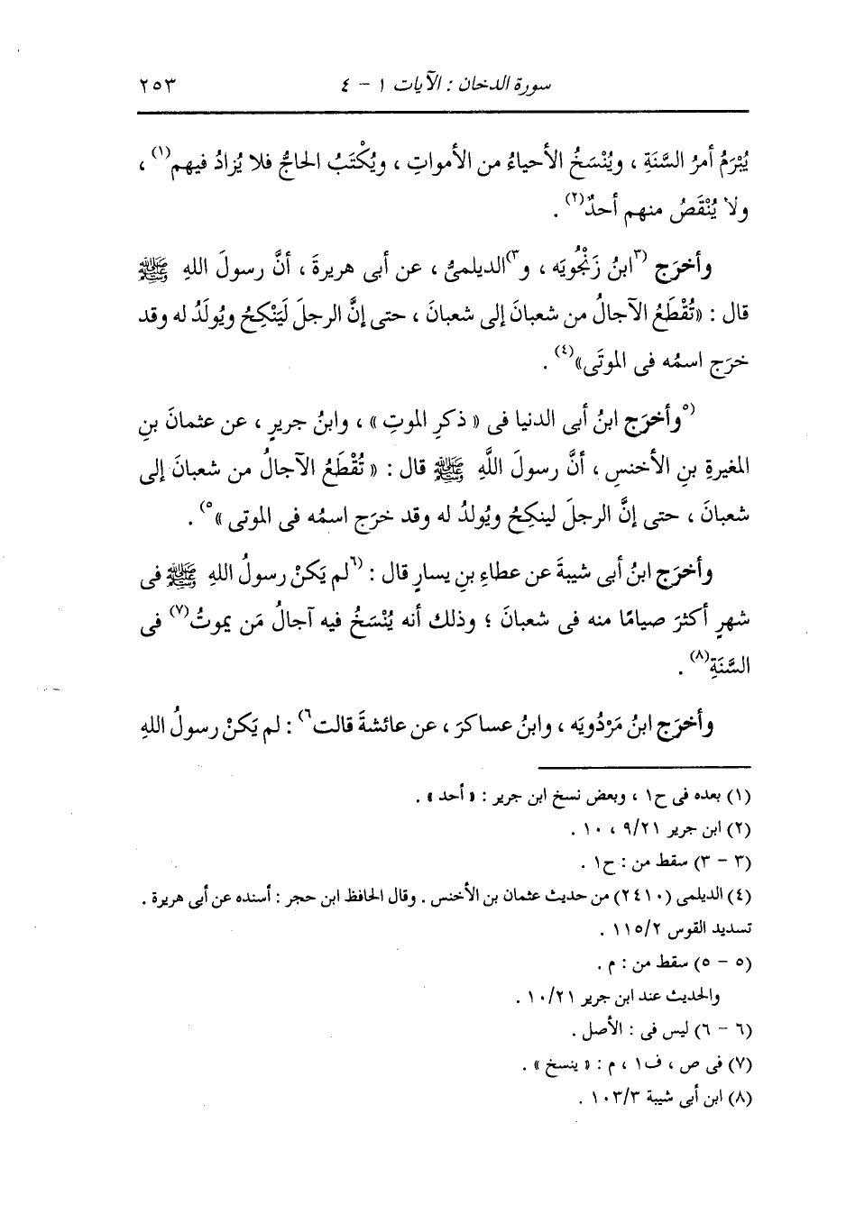 وأخرج ابن جرير والبيهقي في شعب الإيمان عن الزهري عن عثمان بن محمد بن المغيرة بن الأخنس قال : قال رسول الله صلى الله عليه وسلم : تقطع الآجال من شعبان إلى شعبان حتى أن الرجل ينكح ويولد له وقد خرج اسمه في الموتى قال : الزهري وحدثني أيضا عثمان بن محمد بن المغيرة أن رسول الله صلى الله عليه وسلم قال : ما من يوم