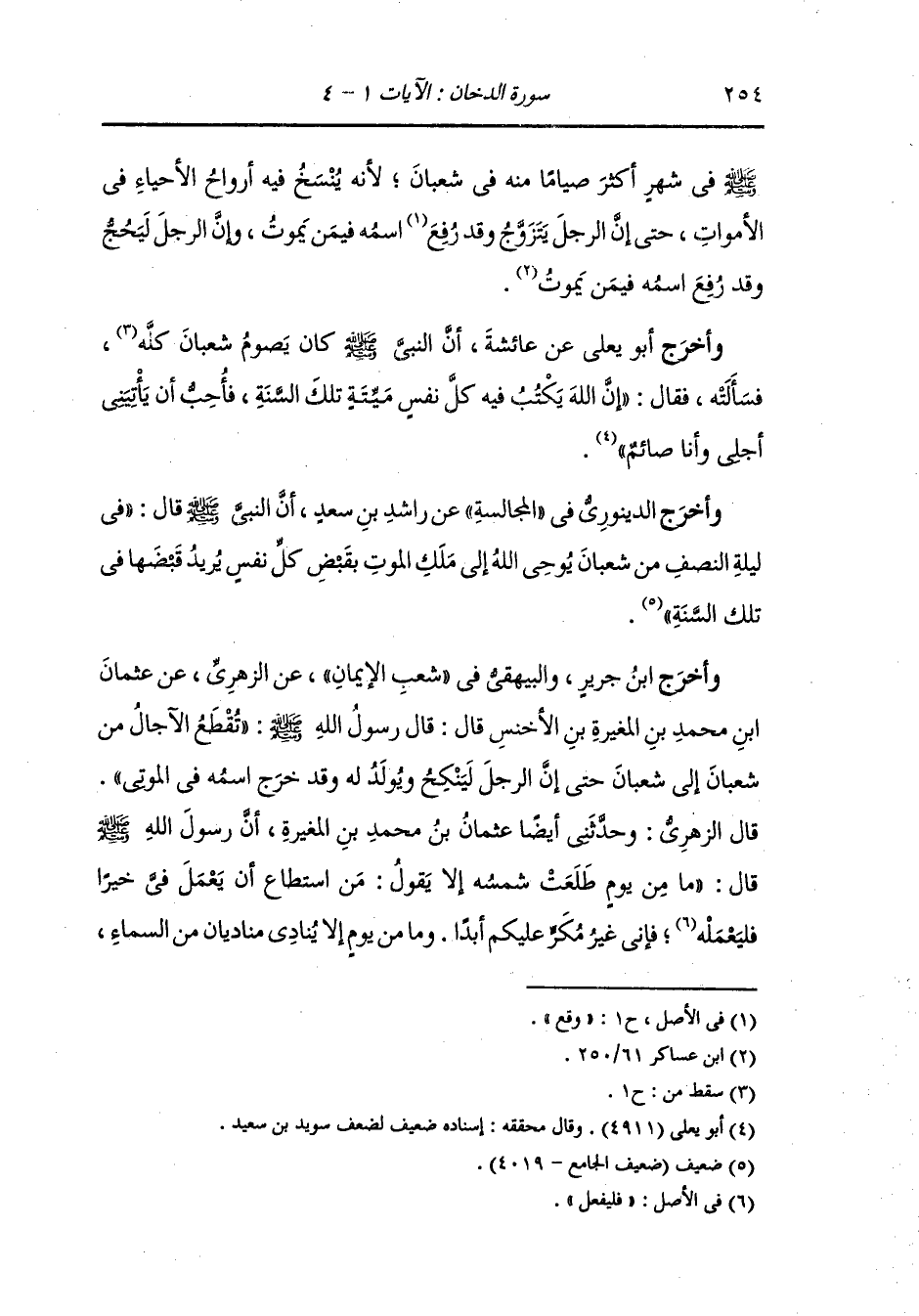 وأخرج ابن أبي الدنيا عن عطاء بن يسار قال : إذا كان ليلة النصف من شعبان دفع إلى ملك الموت صحيفة فيقال اقبض من في هذه الصحيفة فإن العبد ليفرش الفراش وينكح الأزواج ويبني البنيان وإن اسمه قد نسخ في الموتى.