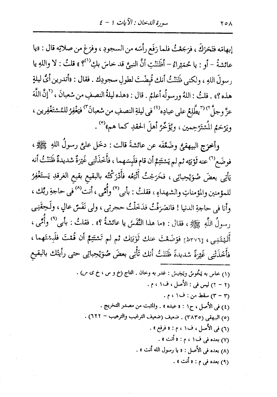 وأخرج البيهقي عن عائشة قالت : كانت ليلة النصف من شعبان ليلتي وكان رسول الله صلى الله عليه وسلم عندي فلما كان في جوف الليل فقدته فأخذني ما يأخذ النساء من الغيرة فتلفعت بمرطي فطلبته في حجر نسائه فلم أجده فانصرفت إلى حجرتي فإذا أنا به كالثوب الساقط وهو يقول في سجوده :
