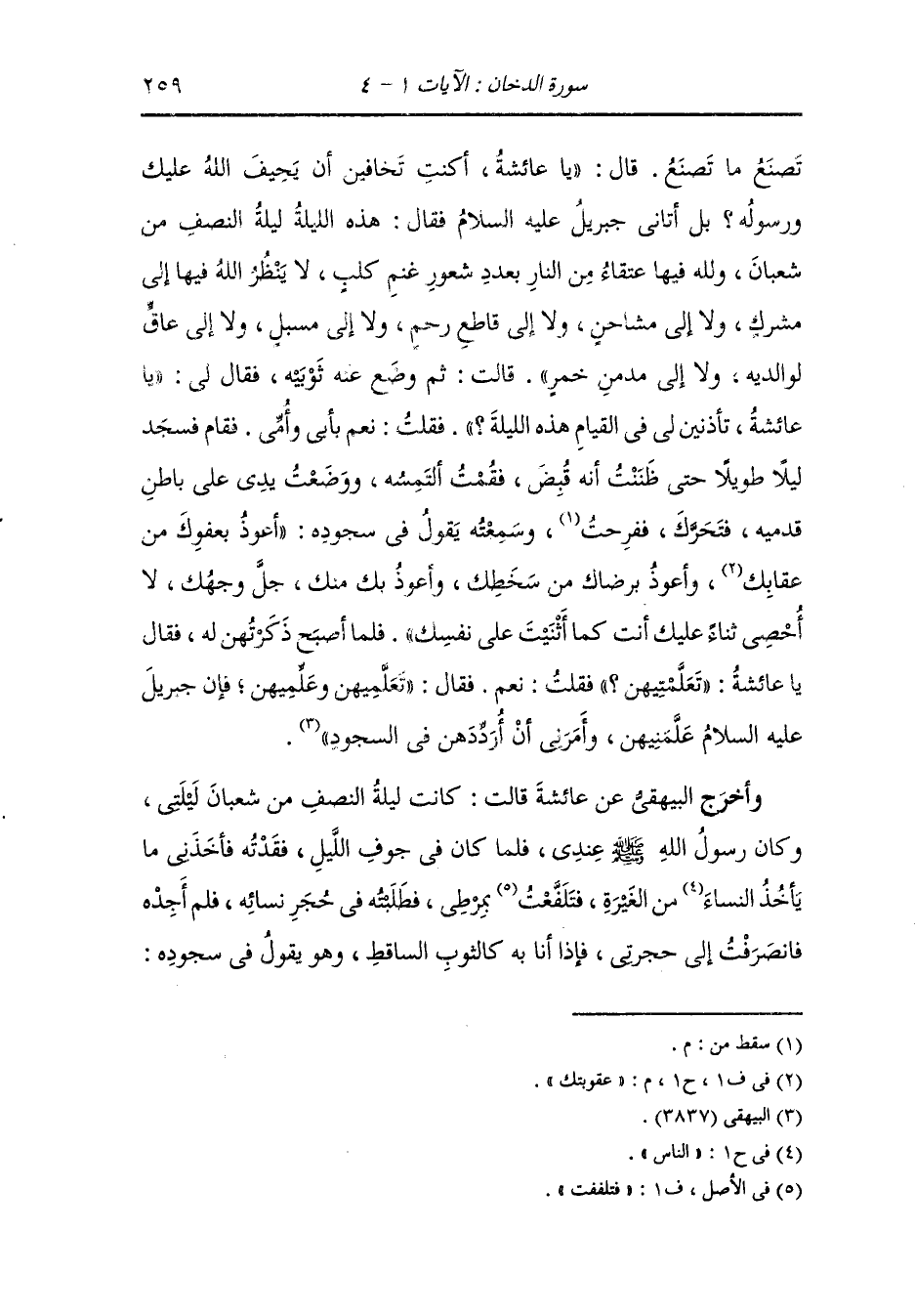 سجد لك خيالي وسوادي وآمن بك فؤادي فهذه يدي وما جنيت بها على نفسي يا عظيم يرجى لكل عظيم يا عظيم اغفر الذنب العظيم سجد وجهي للذي خلقه وشق سمعه وبصره ثم رفع رأسه ثم عاد ساجدا فقال : أعوذ برضاك من سخطك وأعوذ بعفوك من عقابك وأعوذ بك منك أنت كما أثنيت على نفسك أقول كما قال أخي داود أعفر وجهي في التراب لسيدي وحق له أن يسجد ثم رفع رأسه فقال : اللهم ارزقني قلبا تقيا من الشر نقيا لا جافيا ولا شقيا ثم انصرف فدخل معي في الخميلة ولي نفس عال فقال ما هذا النفس يا حميراء فأخبرته فطفق يمسح بيديه على ركبتي ويقول : ويح هاتين الركبتين ما لقيتا في هذه الليلة هذه ليلة النصف من شعبان ينزل الله فيها إلى السماء الدنيا فيغفر لعباده إلا المشرك والمشاحن.