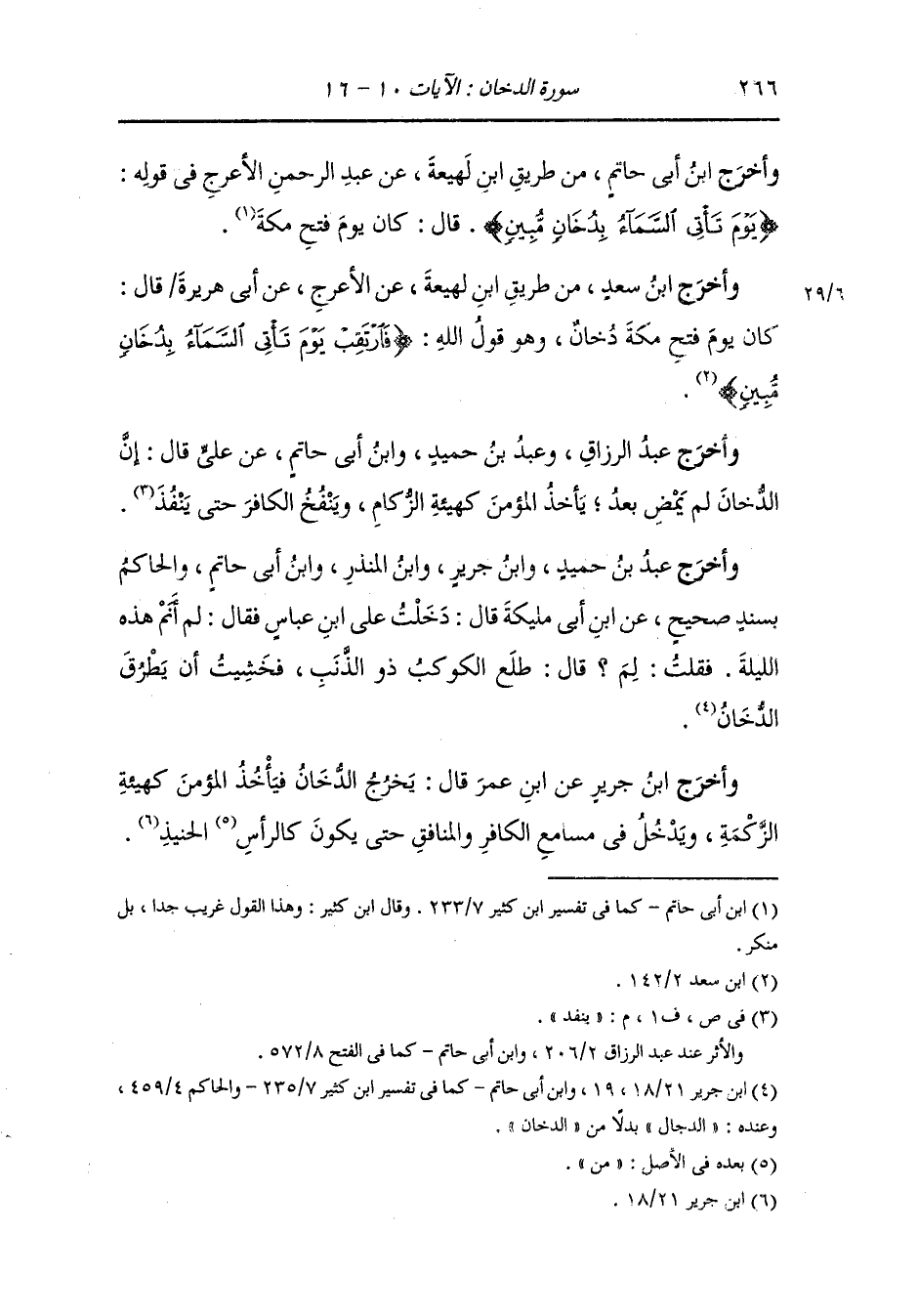 وأخرج ابن جرير عن حذيفة بن اليمان مرفوعا : أول الآيات : الدجال ونزول عيسى ونار تخرج من قعر عدن أبين تسوق الناس إلى المحشر تقيل معهم إذا قالوا والدخان قال : حذيفة يا رسول الله وما الدخان فتلا رسول الله صلى الله عليه وسلم {فارتقب يوم تأتي السماء بدخان مبين} يملأ ما بين المشرق والمغرب يمكث أربعين يوما وليلة أما المؤمن فيصيبه منه كهيئة الزكمة وأما الكافر بمنزلة السكران يخرج من منخريه وأذنيه ودبره.