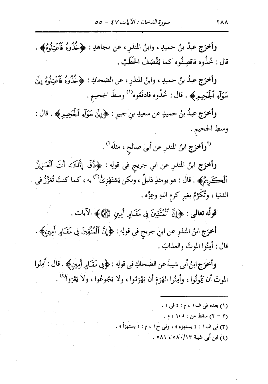 وأخرج عَبد بن حُمَيد ، وَابن جَرِير عن قتادة في قوله {إن المتقين في مقام أمين} قال أمين من الشيطان والأوصاب والأحزان وفي قوله {وزوجناهم بحور عين} قال : بيض عين ، قال : وفي قراءة ابن مسعود بعيس عين وفي قوله {يدعون فيها بكل فاكهة آمنين} قال : أمنوا من الموت والأوصاب والشيطان.