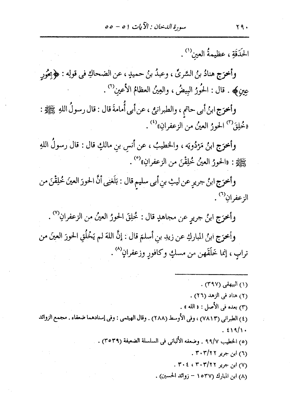 وأخرج ابن أبي الدنيا عن ابن عباس قال : لو أن حوراء أخرجت كفها بين السماء والأرض لافتتن الخلائق بحسنها ولو أخرجت نصيفها لكانت الشمس عند حسنه مثل الفتيلة في الشمس لا ضوء لها ولو أخرجت وجهها لأضاء حسنها ما بين السماء والأرض.