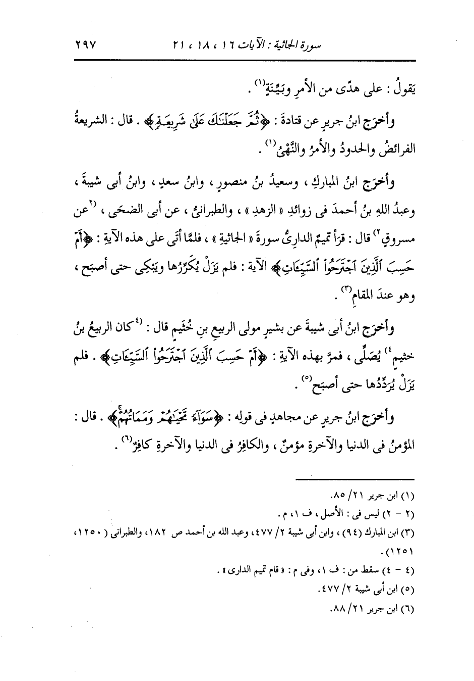أَخْرَج ابن جرير ، وَابن المنذر ، وَابن أبي حاتم واللالكائي في السنة والبيهقي في الأسماء والصفات عن ابن عباس رضي الله عنهما في الآية {أفرأيت من اتخذ إلهه هواه} قال : ذاك الكافر اتخذ دينه بغير هدى من الله ولا برهان {وأضله الله على علم} يقول : أضله الله في سابق علمه.