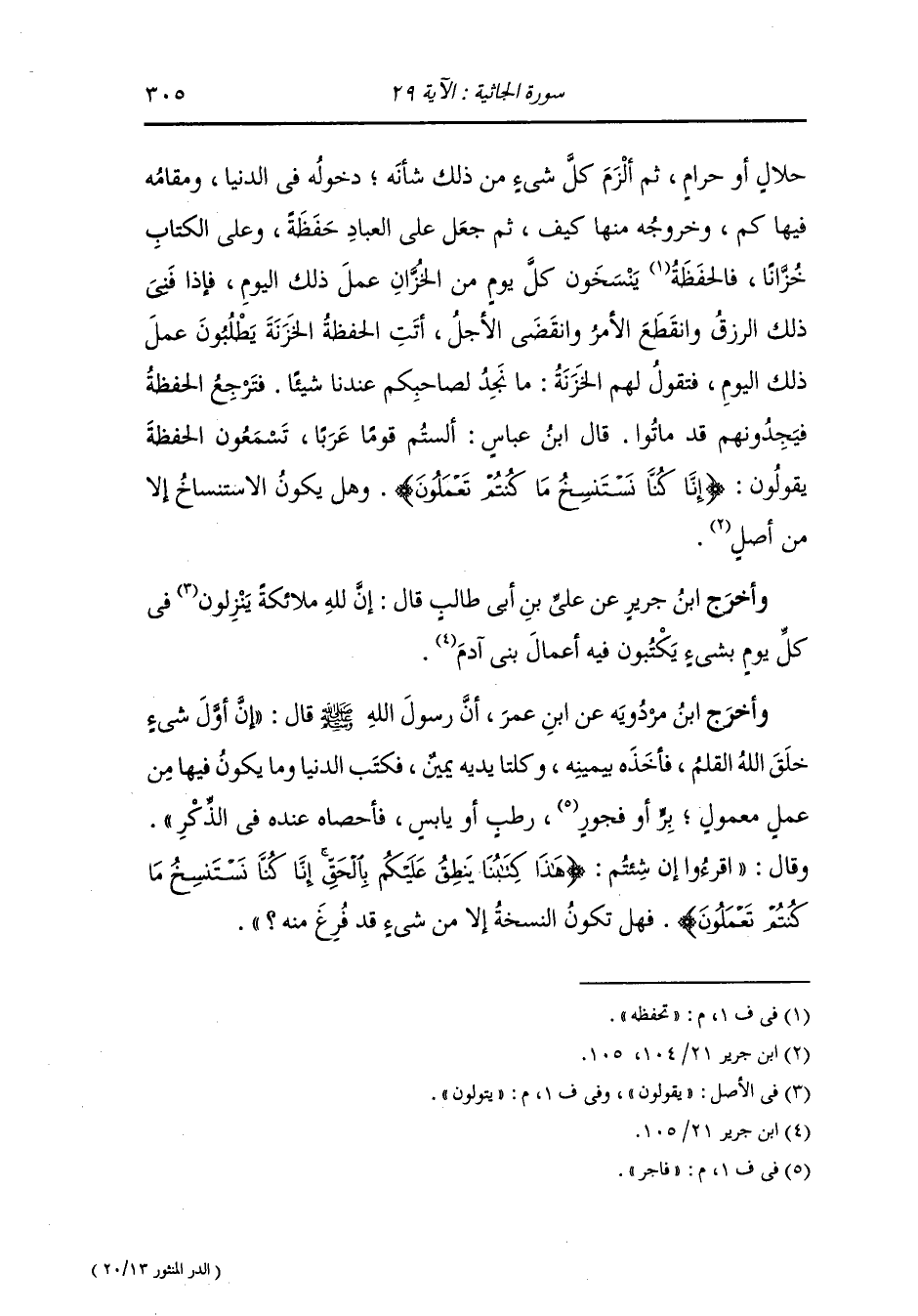 وأخرج ابن مردويه بسند ضعيف عن ابن عباس رضي الله عنهما عن النَّبِيّ صلى الله عليه وسلم في قوله {إنا كنا نستنسخ ما كنتم تعملون} قال : هي أعمال أهل الدنيا الحسنات والسيئات تنزل من السماء كل غداة أو عشية ما يصيب الإنسان في ذلك اليوم أو الليلة الذي يقتل والذي يغرق والذي يقع من فوق بيت والذي يتردى من فوق جبل والذي يقع في بئر والذي يحرق بالنار فيحفظون عليه ذلك كله ، فإذا كان العشي صعدوا به إلى السماء فيجدونه كما في السماء مكتوبا في الذكر الحكيم.