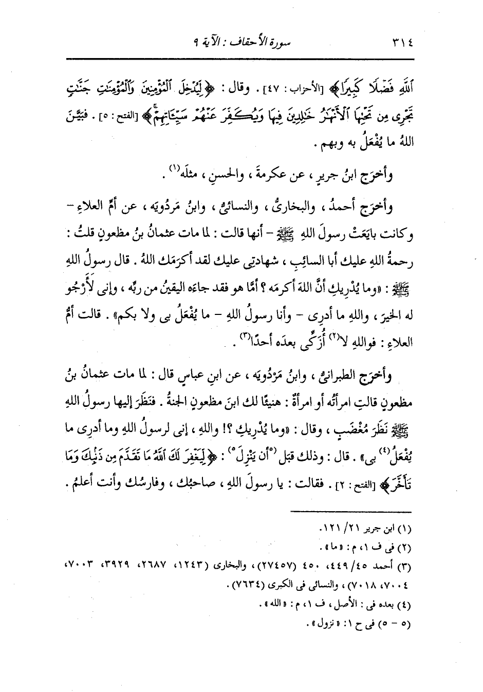 وأخرج ابن حبان والطبراني عن زيد بن ثابت رضي الله عنه أن عثمان بن مظعون رضي الله عنه لما قبض قالت أم العلاء : طبت أبا السائب نفسا إنك في الجنة ، فقال النَّبِيّ صلى الله عليه وسلم : وما يدريك قالت : يا رسول الله عثمان بن مظعون قال : أجل ما رأينا إلا خيرا والله ما أدري ما يصنع بي.