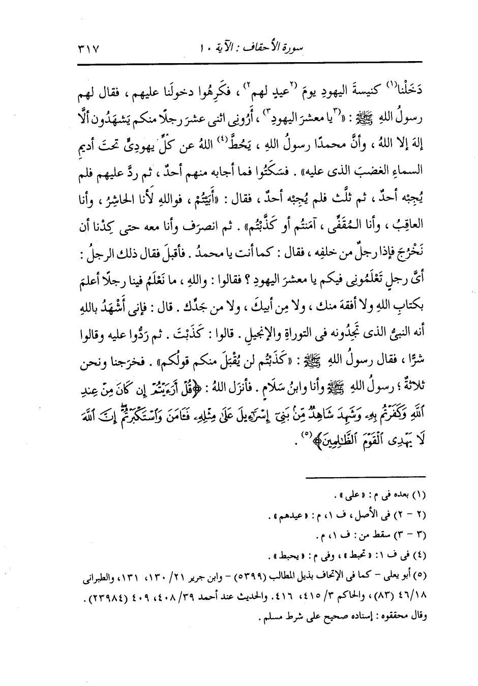 وأخرج الترمذي ، وَابن جَرِير ، وَابن مردويه عن عبد الله بن سلام رضي الله عنه قال : نزلت في آيات من كتاب الله نزلت في {وشهد شاهد من بني إسرائيل على مثله فآمن واستكبرتم إن الله لا يهدي القوم الظالمين} ونزل في (قل كفى بالله شهيدا بيني وبينكم ومن عنده علم الكتاب) (الأحقاف الآية 16).