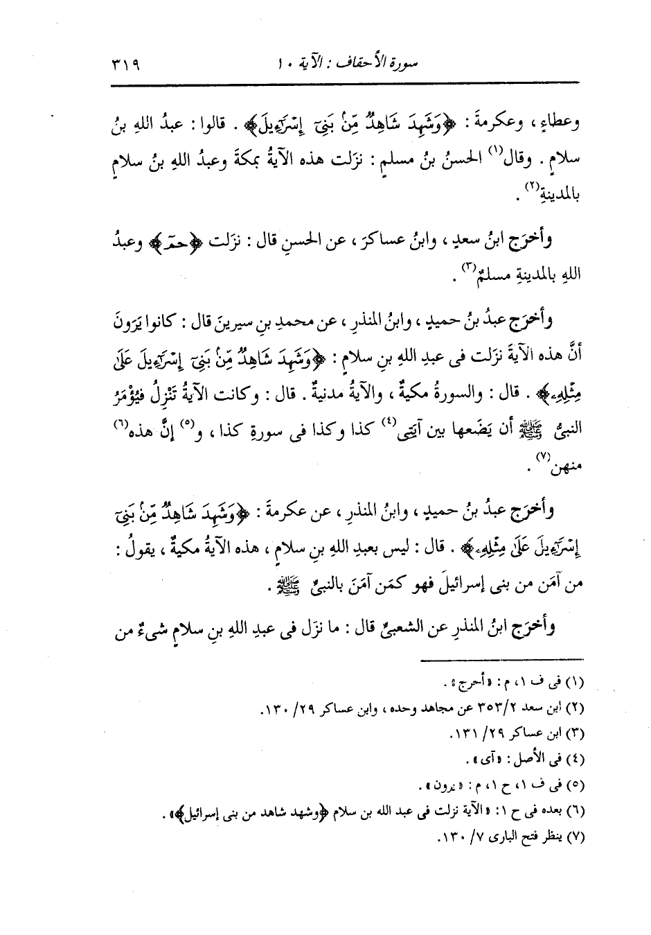 وأخرج ابن جرير ، وَابن أبي حاتم عن مسروق رضي الله عنه في قوله {وشهد شاهد من بني إسرائيل على مثله} قال : والله ما نزلت في عبد الله بن سلام ما نزلت إلا بمكة وإنما كان إسلام ابن سلام بالمدينة وإنما كانت خصومة خاصم بها محمد صلى الله عليه وسلم.