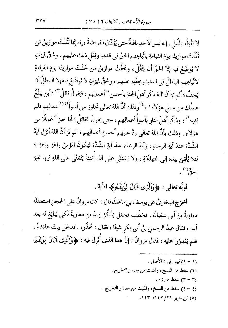 وأخرج عَبد بن حُمَيد والنسائي ، وَابن المنذر والحاكم وصححه ، وَابن مردويه عن محمد بن زياد قال : لما بايع معاوية لابنه قال مروان : سنة أبي بكر وعمر فقال عبد الرحمن : سنة هرقل وقيصر ، فقال مروان : هذا الذي أنزل الله فيه {والذي قال لوالديه أف لكما} الآية فبلغ ذلك عائشة رضي الله عنها فقالت : كذب مروان كذب مروان والله ما هو به ولو شئت أن أسمي الذي أنزلت فيه لسميته ولكن رسول الله صلى الله عليه وسلم لعن أبا مروان في صلبه فمروان فضفض (فضفض : سعة) من لعنة الله.