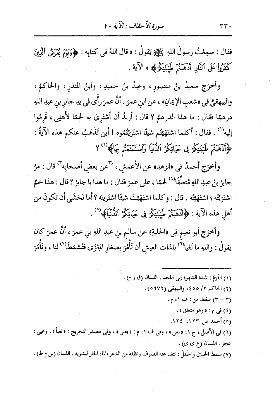وأخرج أبو نعيم عن عبد الرحمن بن أبي ليلى رضي الله عنه قال : قدم على عمر رضي الله عنه ناس من العراق فرأى كأنهم يأكلون هديرا (الهدير : العشب طال وعظم) فقال يا أهل العراق لو شئت أن يدهمق لي كما يدهمق لكم لفعلت ولكنا نستبقي من ربنا ما نجده في آخرتنا أما سمعتم الله يقول لقوم {أذهبتم طيباتكم في حياتكم الدنيا} الآية.