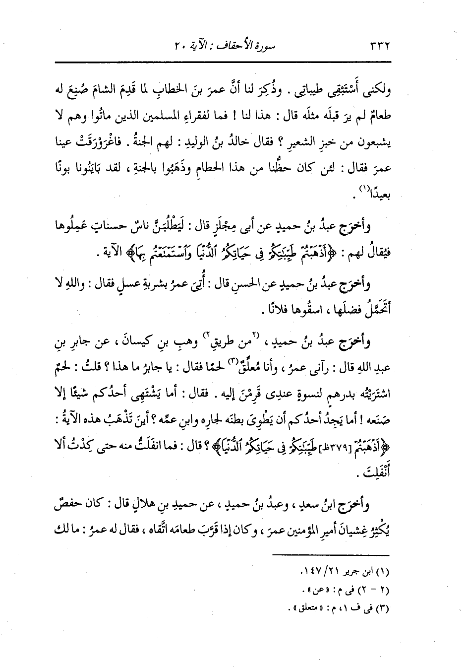 وأخرج ابن المبارك ، وَابن سعد وأحمد في الزهد ، وعَبد بن حُمَيد وأبو نعيم في الحلية عن الحسن قال : قدم وفد أهل البصرة على عمر مع أبي موسى الأشعري فكان له في كل يوم خبز يلت فربما وافقناها مأدومة بزيت وربما وافقناها مأدومة بسمن وربما وافقناها مأدومة بلبن وربما وافقناها القدائد اليابسة قد دقت ثم أغلي لها وربما وافقناها اللحم الغريض وهو قليل ، قال وقال لنا عمر رضي الله عنه : إني والله لقد أرى تقديركم وكراهيتكم طعامي أما والله لو شئت لكنت أطيبكم طعاما وأرقكم عيشا أما والله ما أجهل عن كراكر
