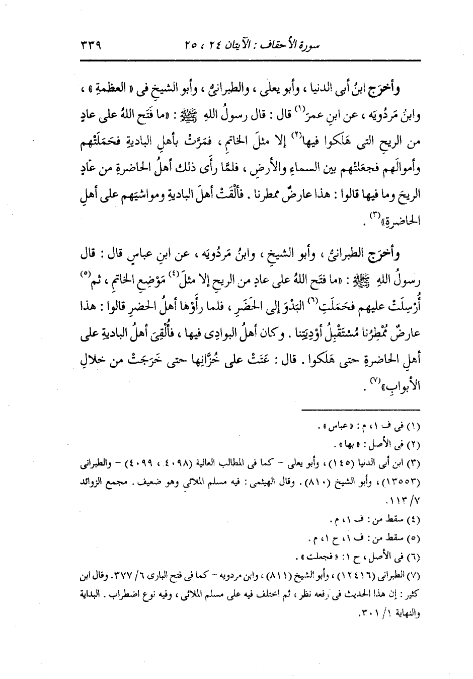 وأخرج ابن أبي شيبة ، وَابن جَرِير عن عمرو بن ميمون رضي الله عنه قال : كان هود قاعدا في قومه فجاء سحاب مكفهر فقالوا {هذا عارض ممطرنا} فقال هود {بل هو ما استعجلتم به ريح فيها عذاب أليم} فجعلت تلقي الفسطاط وتجيء بالرجل الغائب.