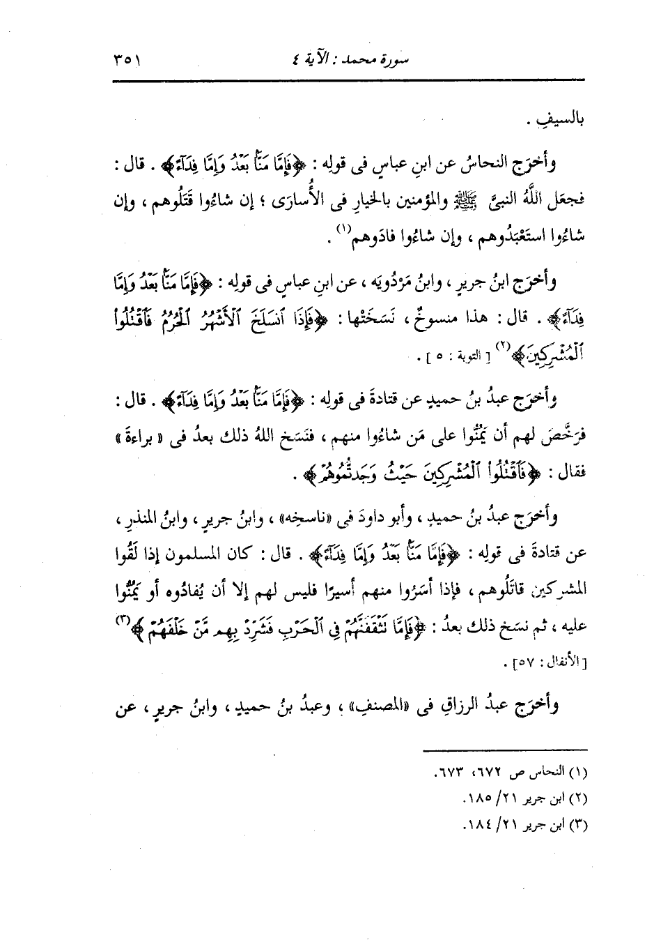 وأخرج ابن جرير ، وَابن مردويه عن الحسن رضي الله عنه قال : أتى الحجاج بأسارى فدفع إلى ابن عمر رضي الله عنهما رجلا يقتله فقال ابن عمر : ليست بهذا أمرنا إنما قال الله {حتى إذا أثخنتموهم فشدوا الوثاق فإما