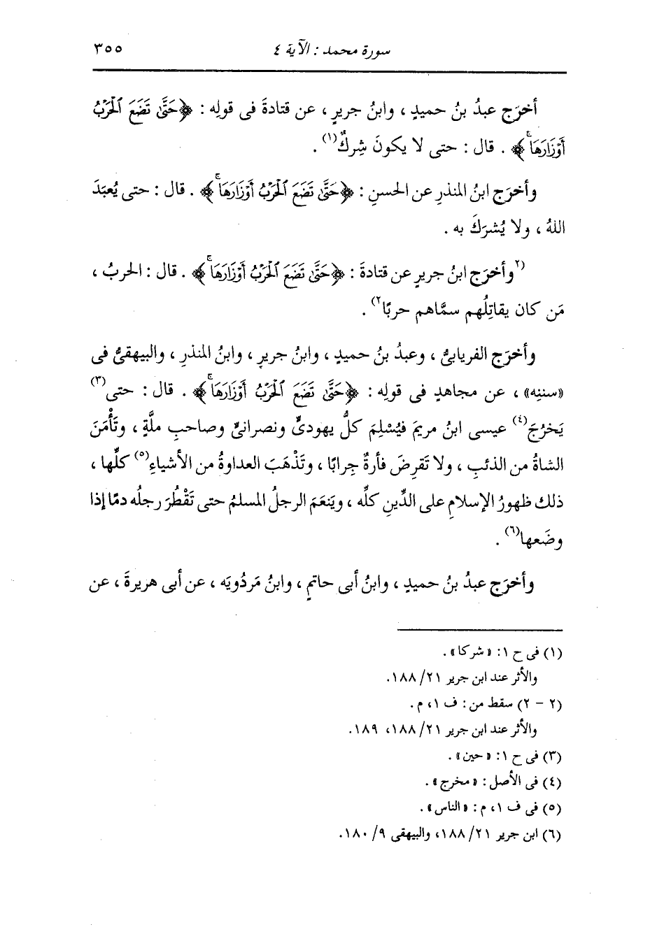 وأخرج عَبد بن حُمَيد عن سعيد بن جبير رضي الله عنه {حتى تضع الحرب أوزارها} قال : خروج عيسى بن مريم عليه السلام.