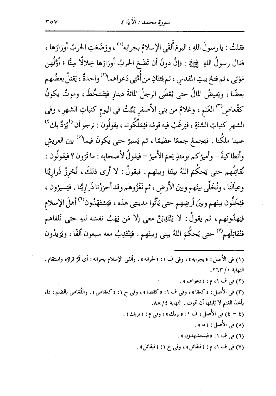 على ذلك فيقول حسبي سبعون ألفا لا تحملهم الأرض وفيهم عين لعدوهم فيأتيهم فيخبرهم بالذي كان فيسيرون إليهم حتى إذا التقوا سألوا أن يخلي بينهم وبين من كان بينهم وبينه نسب فيدعونهم فيقولون ما ترون فيما يقولون فيقول : ما أنتم بأحق بقتالهم ولا أبعد منهم فيقول : فعندكم فأكسروا أغمادكم فيسل الله سيفه عليهم فيقتل منهم الثلثان ويقر في السفن الثلث وصاحبهم فيهم حتى إذا تراءت لهم جبالهم بعث الله عليهم ريحا فردتهم إلى مراسيهم من الشام فأخذوا فذبحوا عند أرجل سفنهم عند الساحل فيومئذ تضع الحرب أوزارها ، أما قوله تعالى : {ذلك ولو يشاء الله لانتصر منهم}.