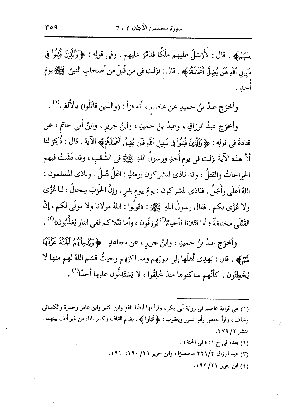 وأخرج عَبد بن حُمَيد ، وَابن جَرِير عن قتادة رضي الله عنه {إن تنصروا الله ينصركم} قال : حق على الله أن يعطي من سأله وأن ينصر من نصره {والذين كفروا فتعسا لهم وأضل أعمالهم ذلك بأنهم كرهوا ما أنزل الله فأحبط أعمالهم} قال : أما الأولى ففي الكفار الذين قتل الله يوم بدر وأما الأخرى ففي الكفار عامة.