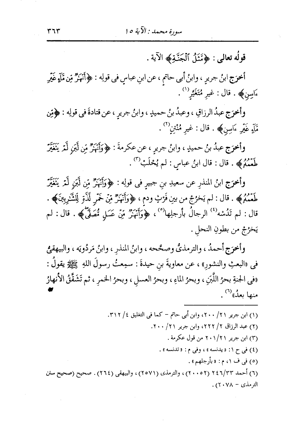 وأخرج ابن مردويه عن الكلبي رضي الله عنه في قوله : {مثل الجنة التي وعد المتقون فيها أنهار من ماء غير آسن} الآية قال : حدثني أبو صالح عن ابن عباس